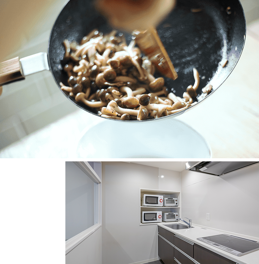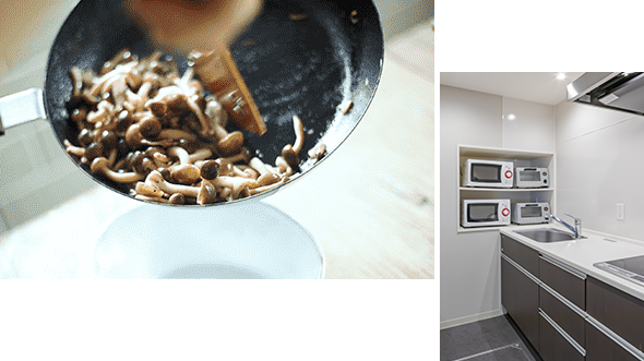 バイトや研究で遅くなる日も安心して召し上がれるように、夕食は夜22:30*まで提供しています。メニューはすべて専属の管理栄養士が年間を通じて作成、毎日食材から調理スタッフが心を込めて手作りします。家庭的なぬくもりと、栄養のバランス、季節が感じられる食事を月〜土、朝夕2回、いつでも出来立てをお召し上がりいただけます。